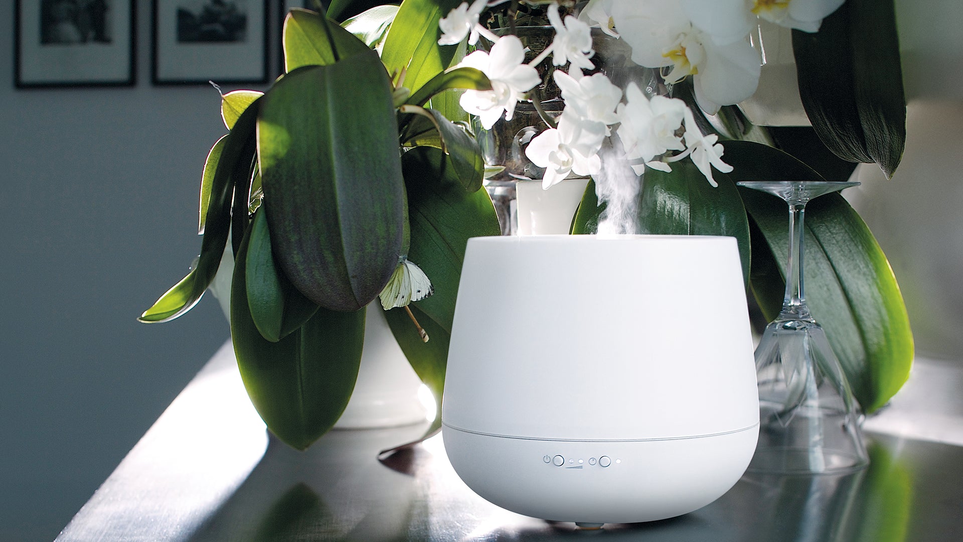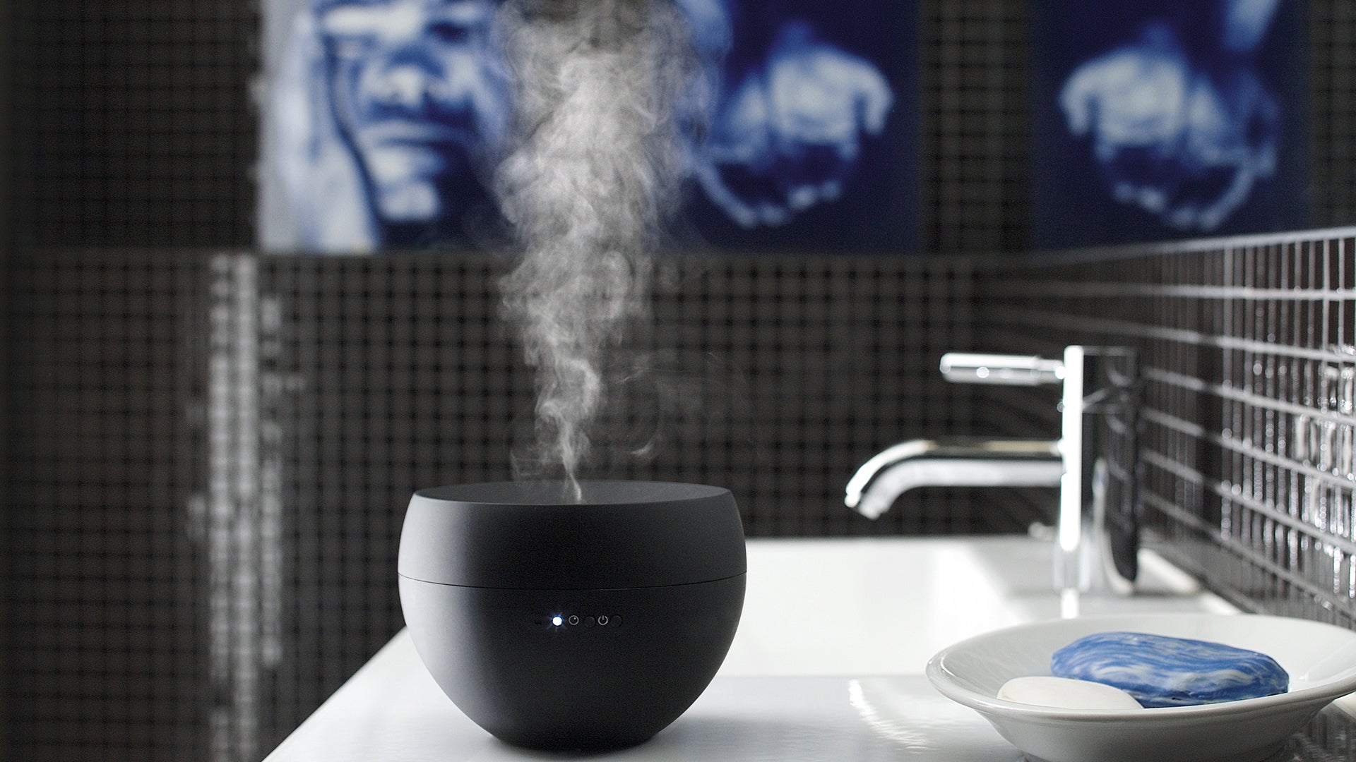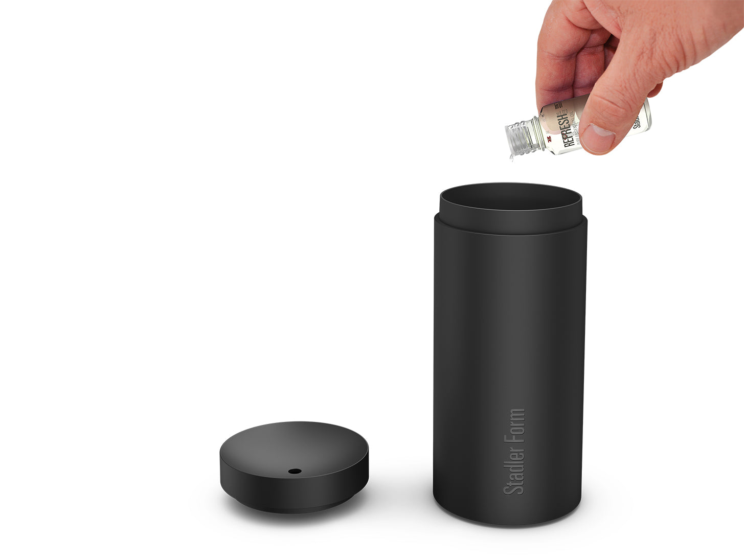 The device is filled with water and fragrance oil. The more oil you use, the more intensive the fragrance will be. An ultrasonic membrane turns the mixture of water and oil into tiny water droplets which are blown into the air as mist by a fan. This is how Stadler Form aroma diffusers Mia, Jasmine, Julia, Lucy and Zoe emit their fragrance.