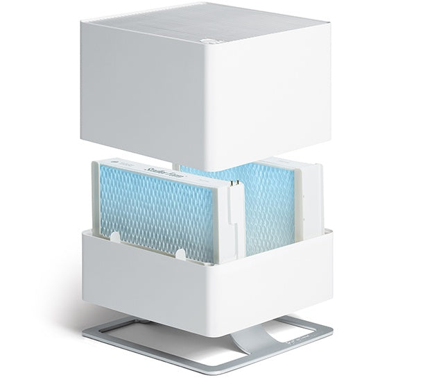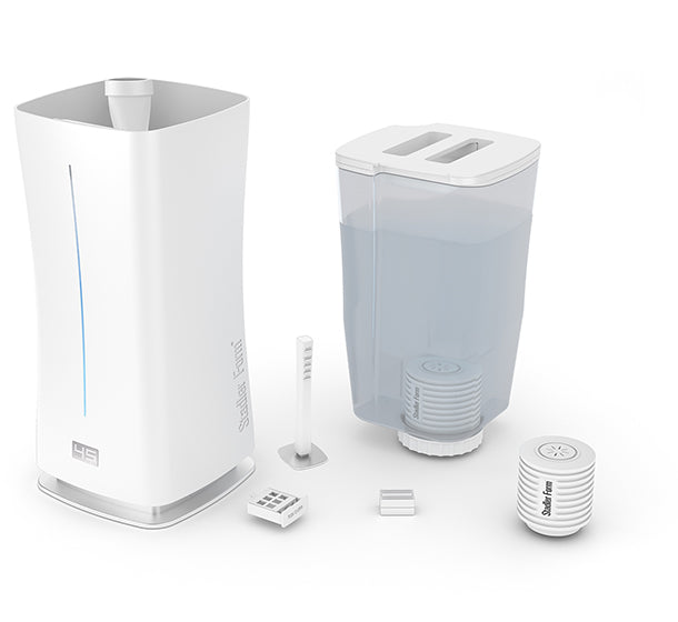 This type of humidification system turns water into mist. An oscillating ultrasonic membrane in the nebuliser atomises the water, turning it into tiny droplets. A built-in fan in the device transports them into the air as mist which humidifies the room air. In principle, the mist emitted by the device is cold because the water inside it is also cold. This makes nebuliser systems suitable for nurseries. With this system, the process of humidification is made visible due to the mist, which is why these devices are also known as atomisers. It is particularly important for nebulisers to be cleaned and descaled regularly. Nebulisers are not suitable for use with hard water or water from a water softener.