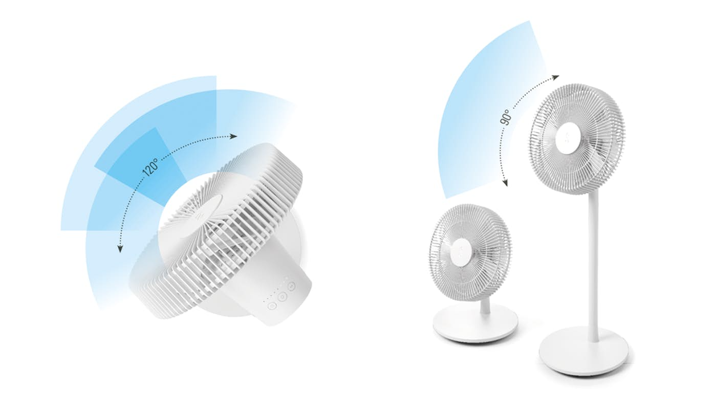 In addition to the automatic horizontal swing function of 120°, the vertical position of the fan head can be adjusted manually from 0° to 90° – with natural breeze mode if required.