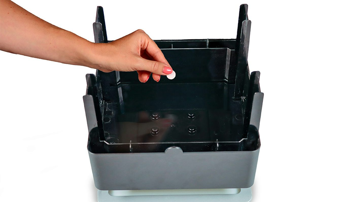 Just add one tablet to the water tank or water container of your humidifier or air washer every two weeks and fill up with water. And that’s it: the hygiene tab will then dissolve without trace and enrich the indoor air with hygienically clean water.